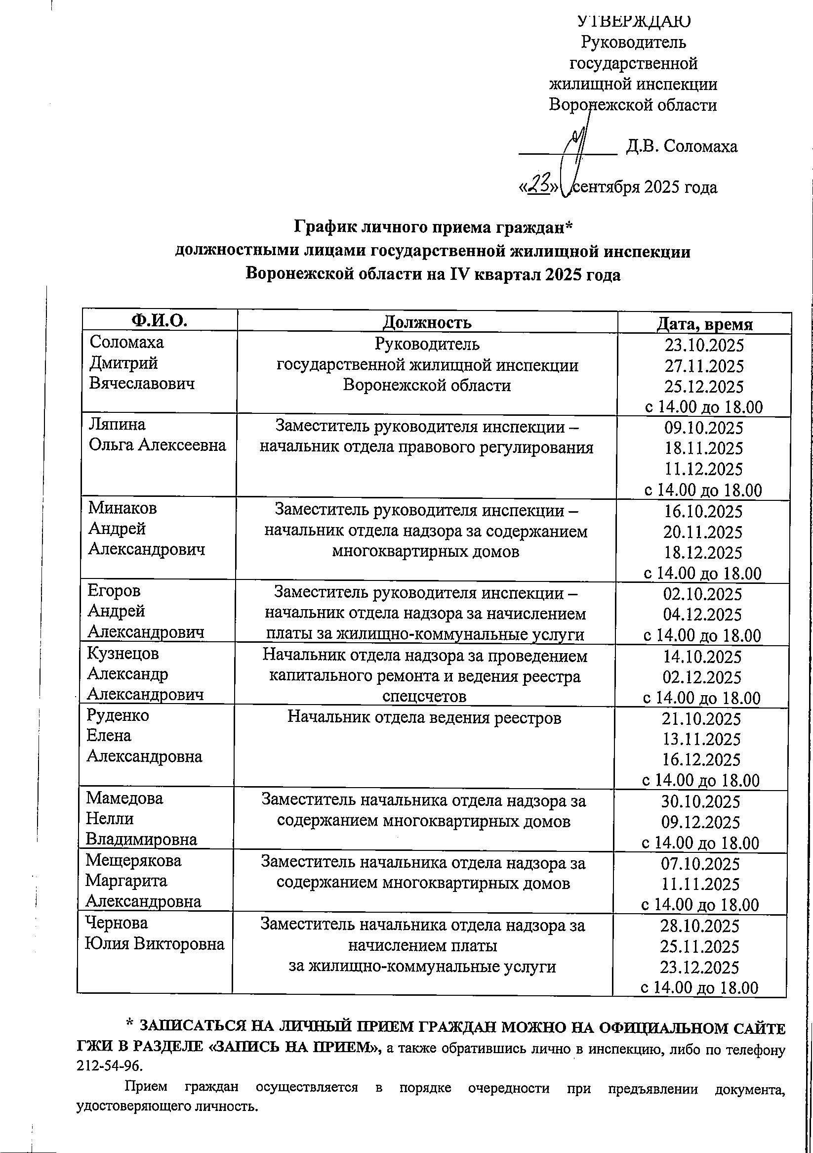 Личный прием граждан в государственной жилищной инспекции Воронежской области проводит руководитель государственной жилищной инспекции Воронежской области Соломаха Дмитрий Вячеславович, или лицо, его замещающее, согласно графику личного приема граждан, утвержденному губернатором Воронежской области (график личного приема размещен в информационной системе «Портал Воронежской области в сети Интернет» на главной странице в подразделе «Анонсы региона»), а также руководители структурных подразделений государственной жилищной инспекции Воронежской области.