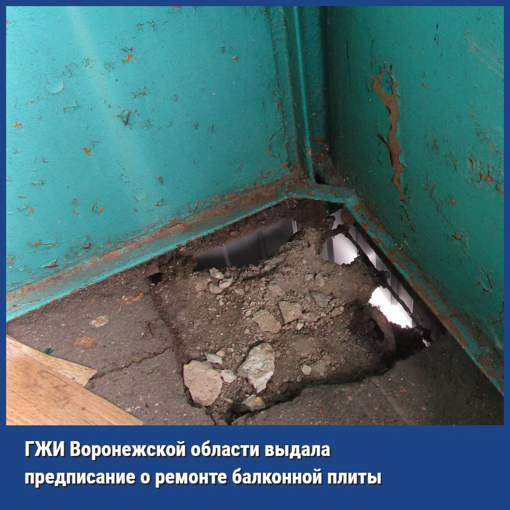 Женщина поспешила обратиться в управляющую домом организацию ООО «УК РЭП-101», но ожидаемого ремонта не получила. Тогда она направила в государственную жилищную инспекцию Воронежской области обращение о бездействии управляющей организации. В ходе проверки жилищный инспектор выявил разрушение балконной плиты, местами до обнажения арматуры.