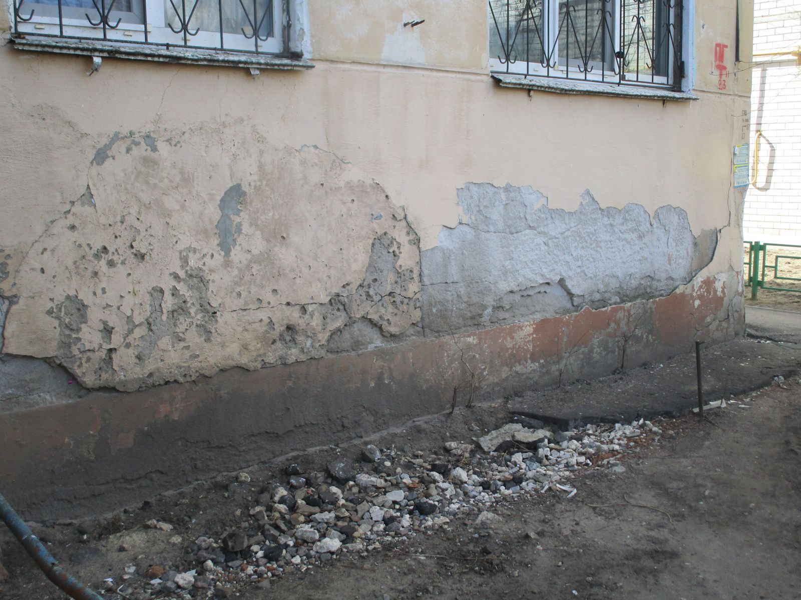 Жилищный инспектор совместно с жителем дома и представителем управляющей организации провел обследование общедомового имущества и выявил, что отмостка по периметру дома разрушена, на козырьках входных групп образовались трещины и появился мох.